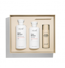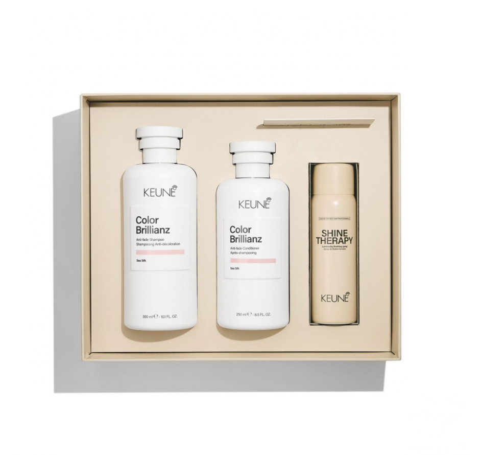 „Keune Shine“ dovanų rinkinys – tai Color Brillianz Anti-Fade šampūnas, Color Brillianz Anti-Fade kondicionierius ir Shine Therapy purškiklis. Šampūnas švelniai valo, padeda išsaugoti plaukų spalvos intensyvumą ir suteikia spindesio. Kondicionierius drėkina, glotnina plaukų paviršių ir padeda spalvai išlikti ryškiai bei žvilgančiai. Ritualą užbaikite su Shine Therapy purškikliu – jis suteikia blizgesio ir glotnumo, nepalikdamas lipnumo pojūčio.