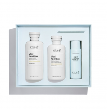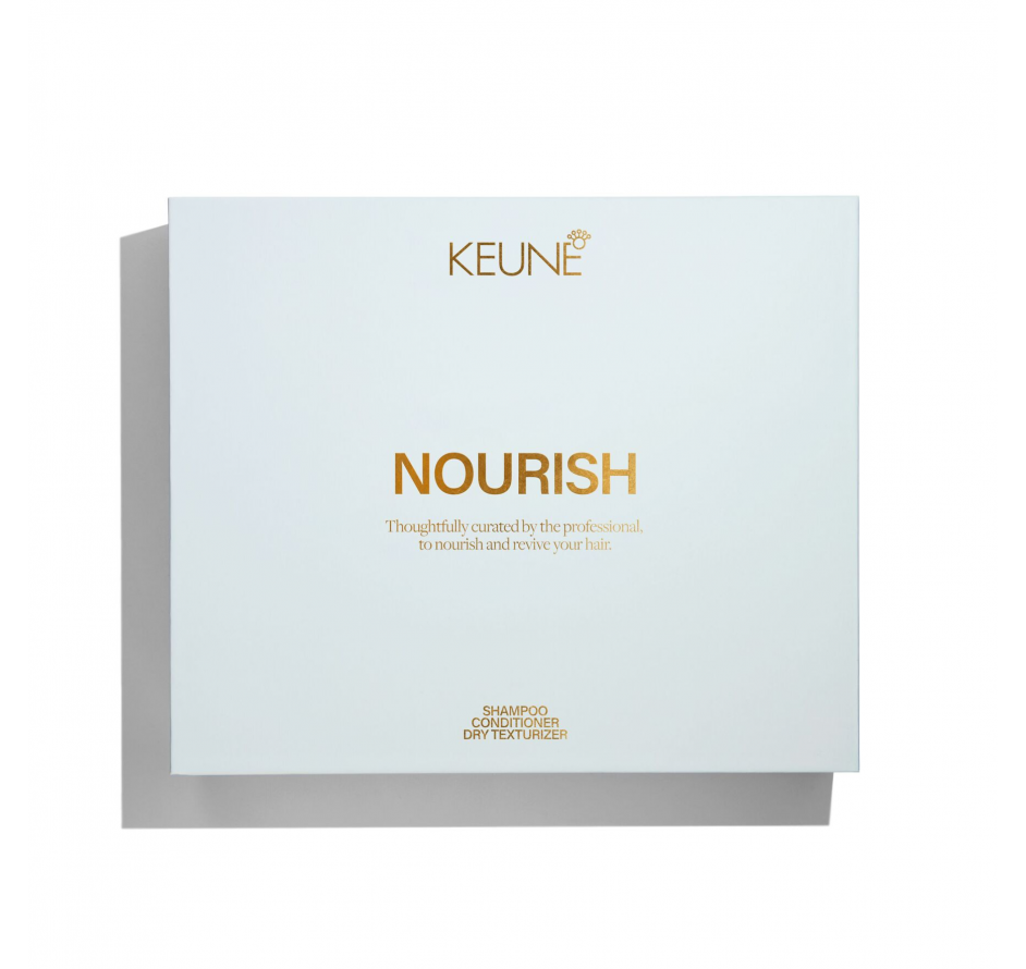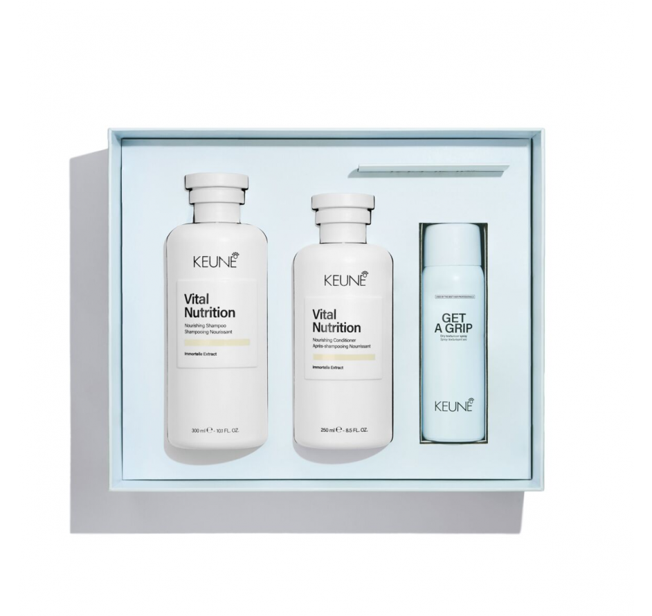 „Keune Nourish“ dovanų rinkinys, kuriame rasite Vital Nutrition maitinamąjį šampūną, Vital Nutrition maitinamąjį kondicionierių ir Get A Grip tekstūros suteikiantį purškiklį. Šampūnas švelniai valo ir atkuria drėgmės balansą sausiems plaukams. Kondicionierius giliai maitina, lengvina iššukavimą ir suteikia plaukams švelnumo, glotnumo bei elastingumo. Plaukų priežiūros ritualo užbaigimui - Get A Grip purškiklis – jis sugeria riebalus, suteikia plaukams lengvos apimties ir vidutinio fiksavimo, nepalikdamas baltų pėdsakų.
