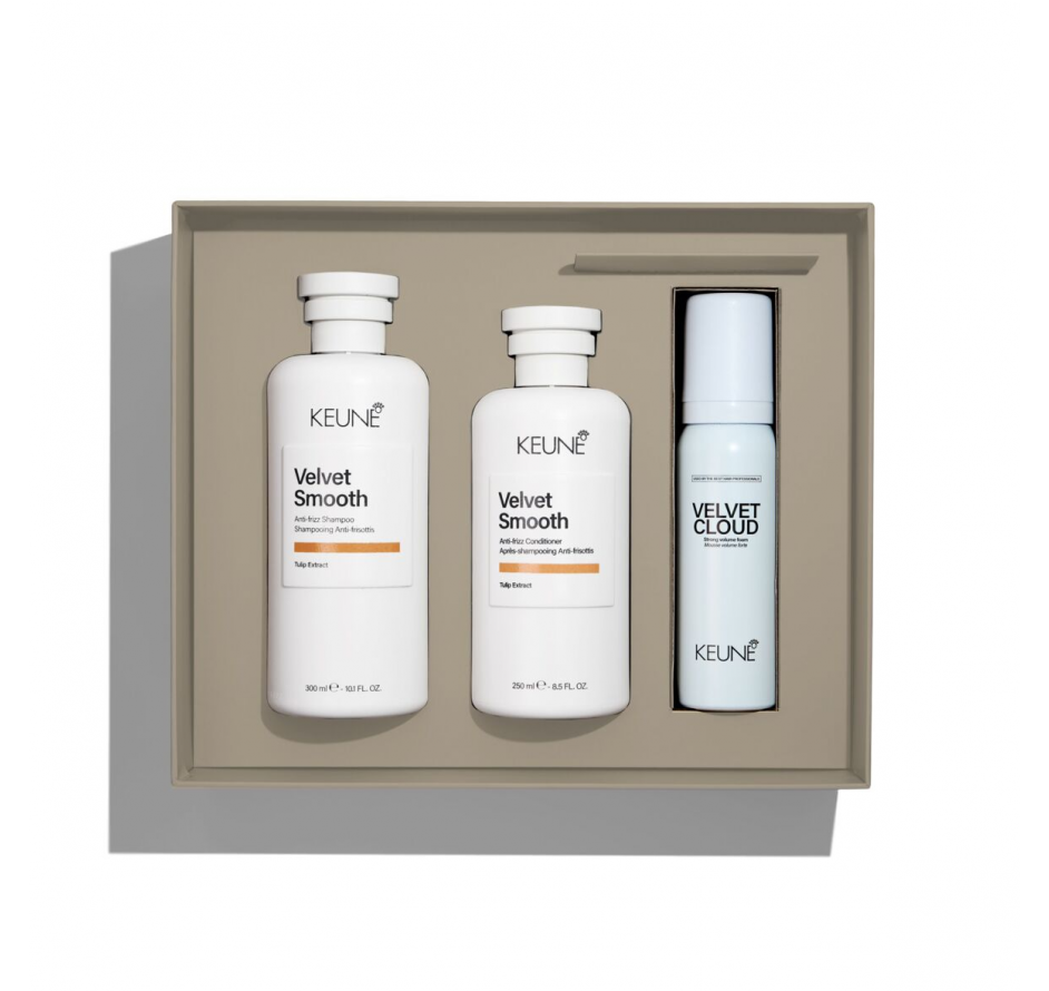 „Keune Velvet“ šventinis rinkinys – tai Velvet Smooth plaukus glotninantis šampūnas šampūnas, Velvet Smooth plaukus glotninantis kondicionierius ir Velvet Cloud apimties suteikiančios putos plaukams. Šampūnas švelniai valo plaukus ir glotnina jų paviršių, mažindamas pasišiaušimą bei nepaklusnius plaukelius – plaukai tampa švelnesni ir lengviau formuojami. Kondicionierius suteikia drėgmės, palengvina iššukavimą ir padeda plaukams išlikti glotniems bei žvilgantiems net esant drėgnam orui. Ritualą užbaikite su Velvet Cloud apimties suteikiančiomis putomis – jos suteikia lengvos apimties ir šilkinio švelnumo pojūtį.